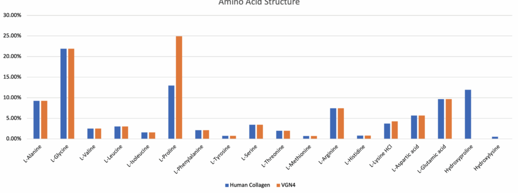 Vollagen® is composed of the same 18 Amino Acids as Human Collagen. The blue bars show the levels and rations of amino acids in Human Collagen, the orange bars show the identical composition of Vollagen®.